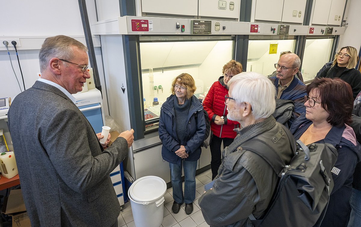 Am 16. Oktober 2025 führte die Präsenzstelle eine Exkursion an den Universitätscampus der Brandenburgischen Technischen Universität (BTU) in Senftenberg durch. Die Teilnehmenden wurden herzlich von Prof. Dr. Jörg Acker empfangen, der die Fachgruppe Physikalische Chemie leitet. In einem kurzweiligen und anschaulichen Vortrag informierten Prof. Acker und seine Mitarbeiterin Anja Rietig über den aktuellen Stand der Forschung im Bereich Batterierecycling.