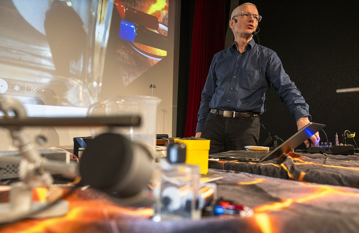 Unterhaltsam, faktenreich und mit viel Humor zeigte er eindrucksvoll physikalische Phänomene, erklärte Hintergründe und führte die Zuschauerinnen und Zuschauer immer wieder gekonnt an die Grenzen ihrer eigenen Wahrnehmung. Komplexe Zusammenhänge wurden leicht verständlich vermittelt und mit humorvollen Momenten aufgelockert, sodass ein lebendiger Zugang zu wissenschaftlichen Themen entstand.