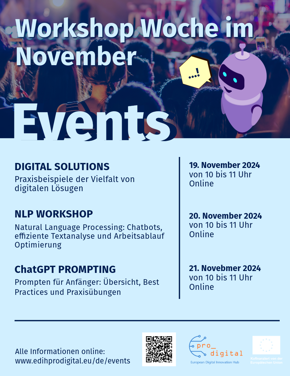 20.11.2024 | 10 – 11 Uhr | Online | Anmeldung: https://edihprodigital.eu/de/event/nlp-workshop