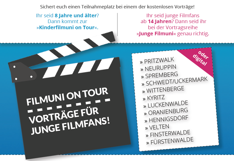 Auch 2021 reist die „Junge Filmuni“ wieder durch Brandenburg und kommt nach Spremberg in die Stadt. Expert*innen der Filmuniversität Babelsberg lassen euch in kostenlosen, spannenden Vorträgen hinter die Kulissen des Filmemachens blicken und ihr erfahrt alles rund um Filmberufe und Studienmöglichkeiten an der Filmuniversität Babelsberg KONRAD WOLF. Die Veranstaltungsreihe richtet sich an Jugendliche ab 14 Jahren, junge Erwachsene und alle Interessierten.
